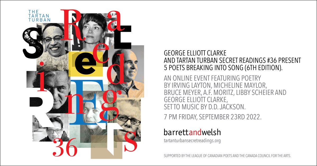 George Elliott Clarke and Tartan Turban Secret Readings #36 present 5 Poets Breaking Into Song (6th Edition). An online event featuring poetry by Irving Layton, Micheline Maylor, Bruce Meyer, A.F. Moritz, Libby Scheier and George Elliott Clarke, set to music by D.D. Jackson.