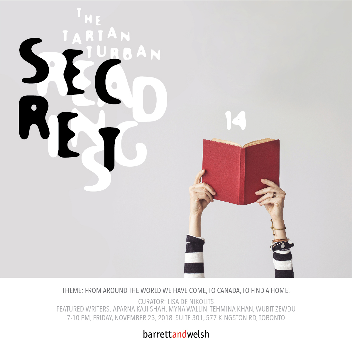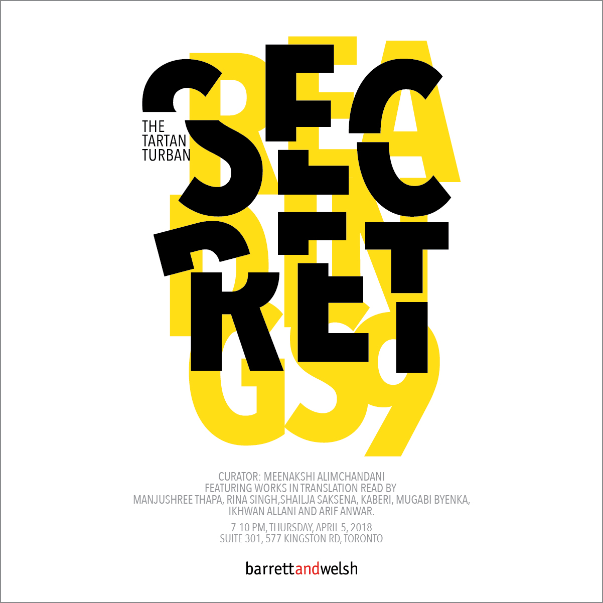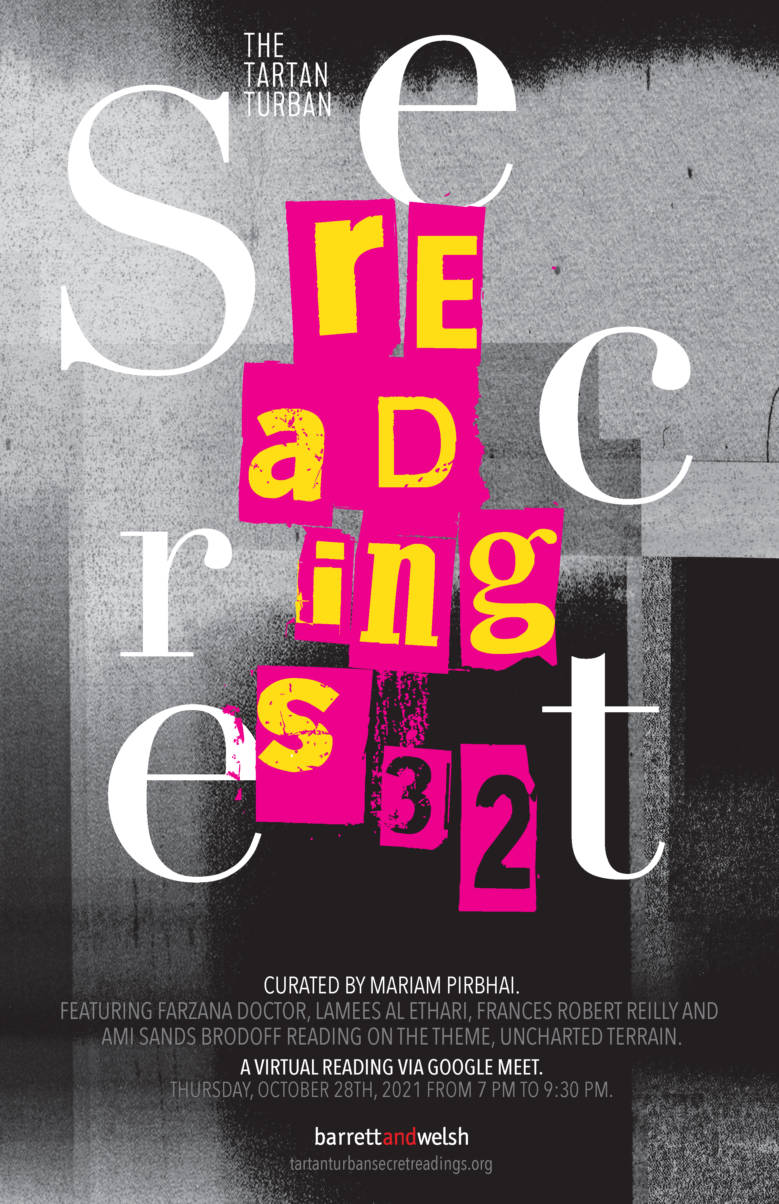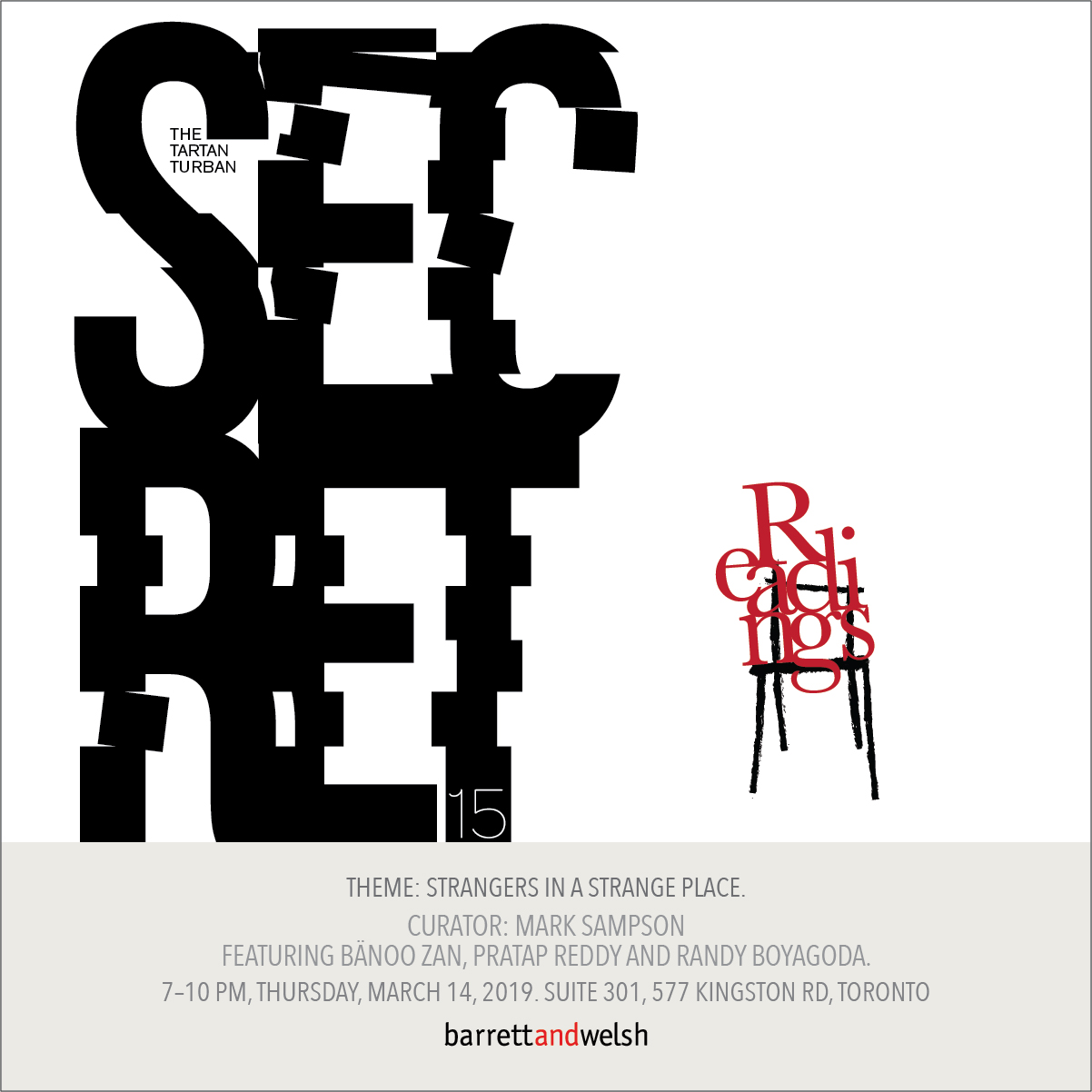 Since TTSR #7, every Tartan Turban Secret Reading has had a unique poster designed by Barrett and Welsh designer Bhupesh Luther, expressly to promote that event. Each poster is an original work of art, using typography and imagery to evoke the theme of one evening or the larger themes of diversity, exile, journey or even the simple act of reading. They are designed to be subtle, visually stimulating, things of beautiful and intellectual depth. The Tartan Turban Secret Readings posters have received design awards in Canada and globally.
