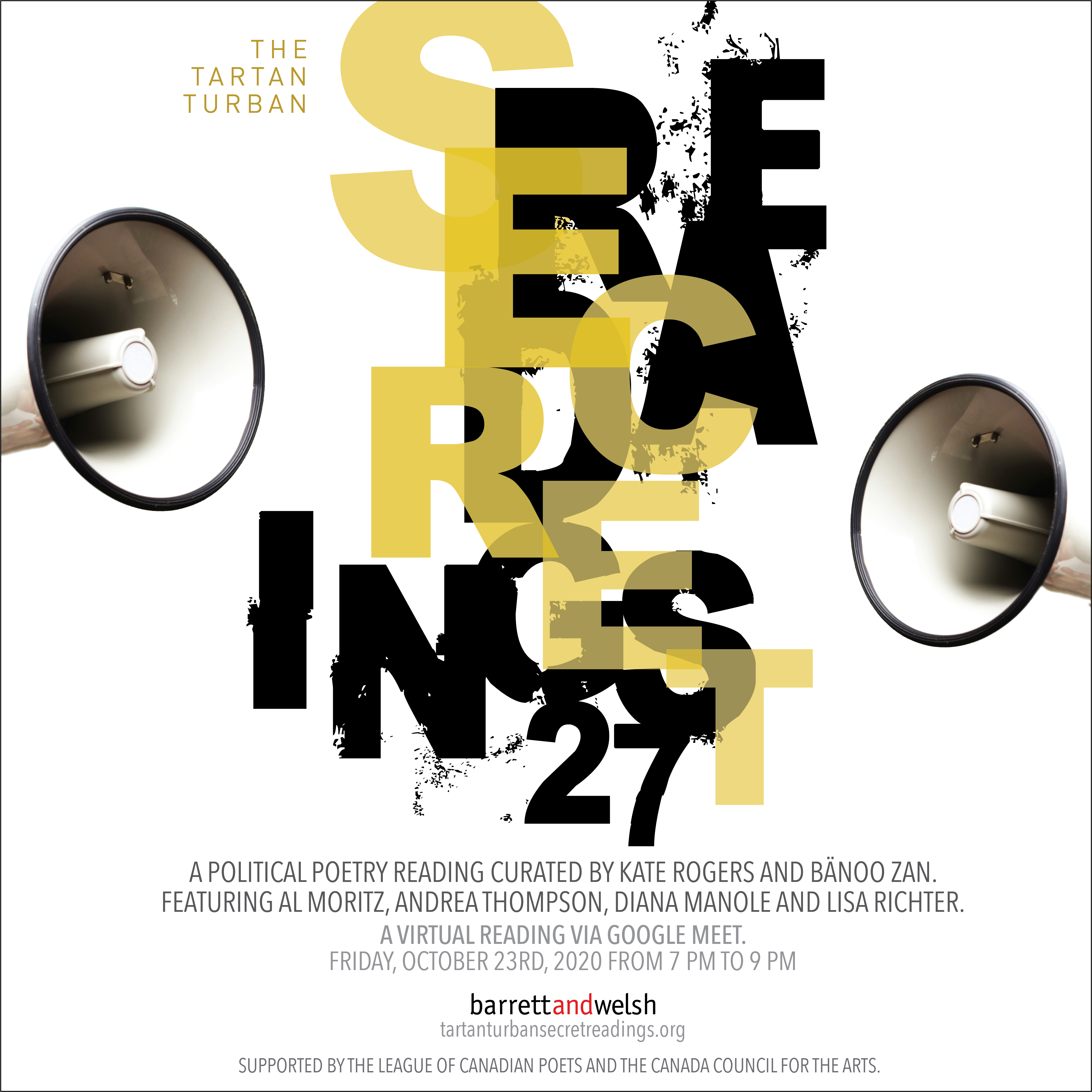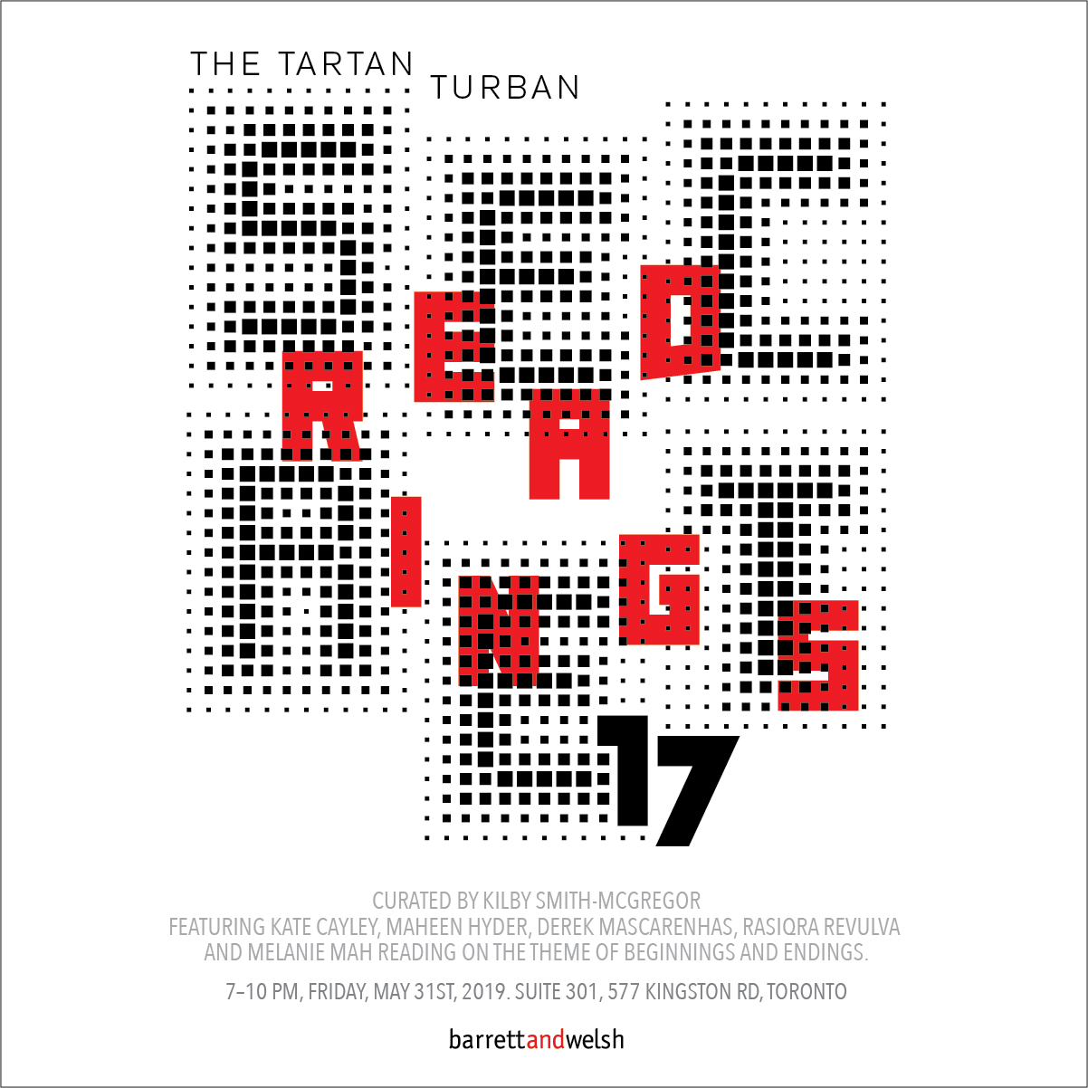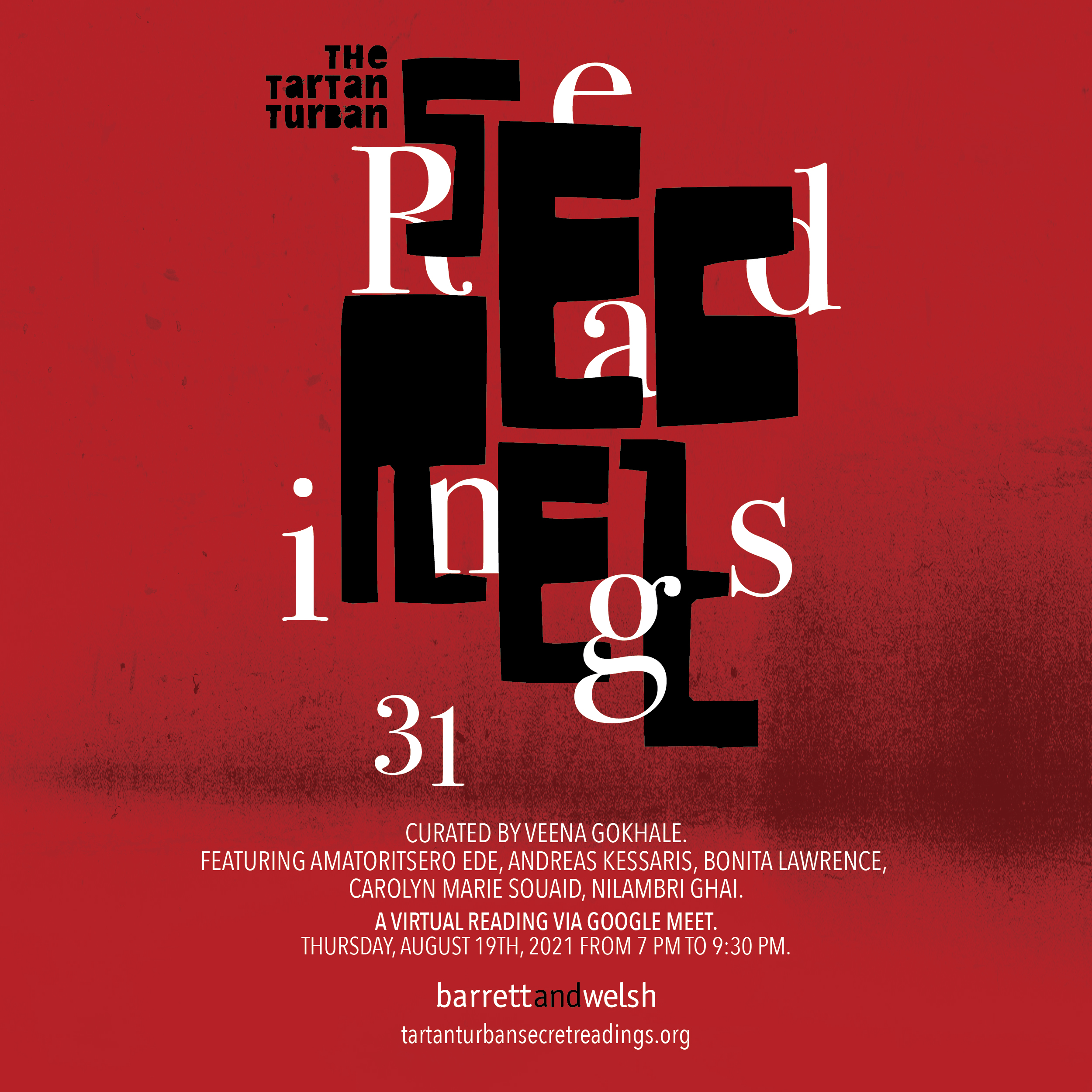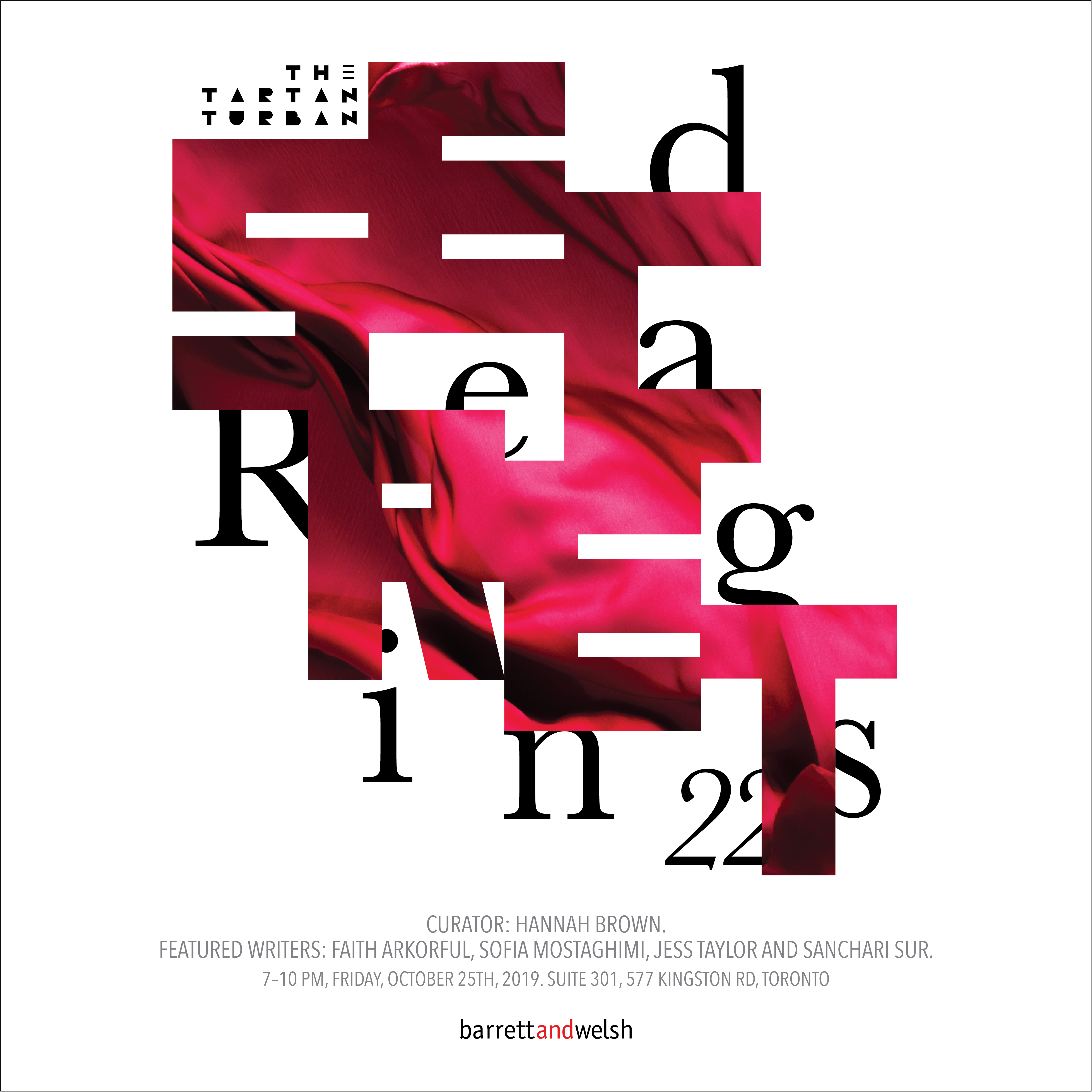 Since TTSR #7, every Tartan Turban Secret Reading has had a unique poster designed by Barrett and Welsh designer Bhupesh Luther, expressly to promote that event. Each poster is an original work of art, using typography and imagery to evoke the theme of one evening or the larger themes of diversity, exile, journey or even the simple act of reading. They are designed to be subtle, visually stimulating, things of beautiful and intellectual depth. The Tartan Turban Secret Readings posters have received design awards in Canada and globally.